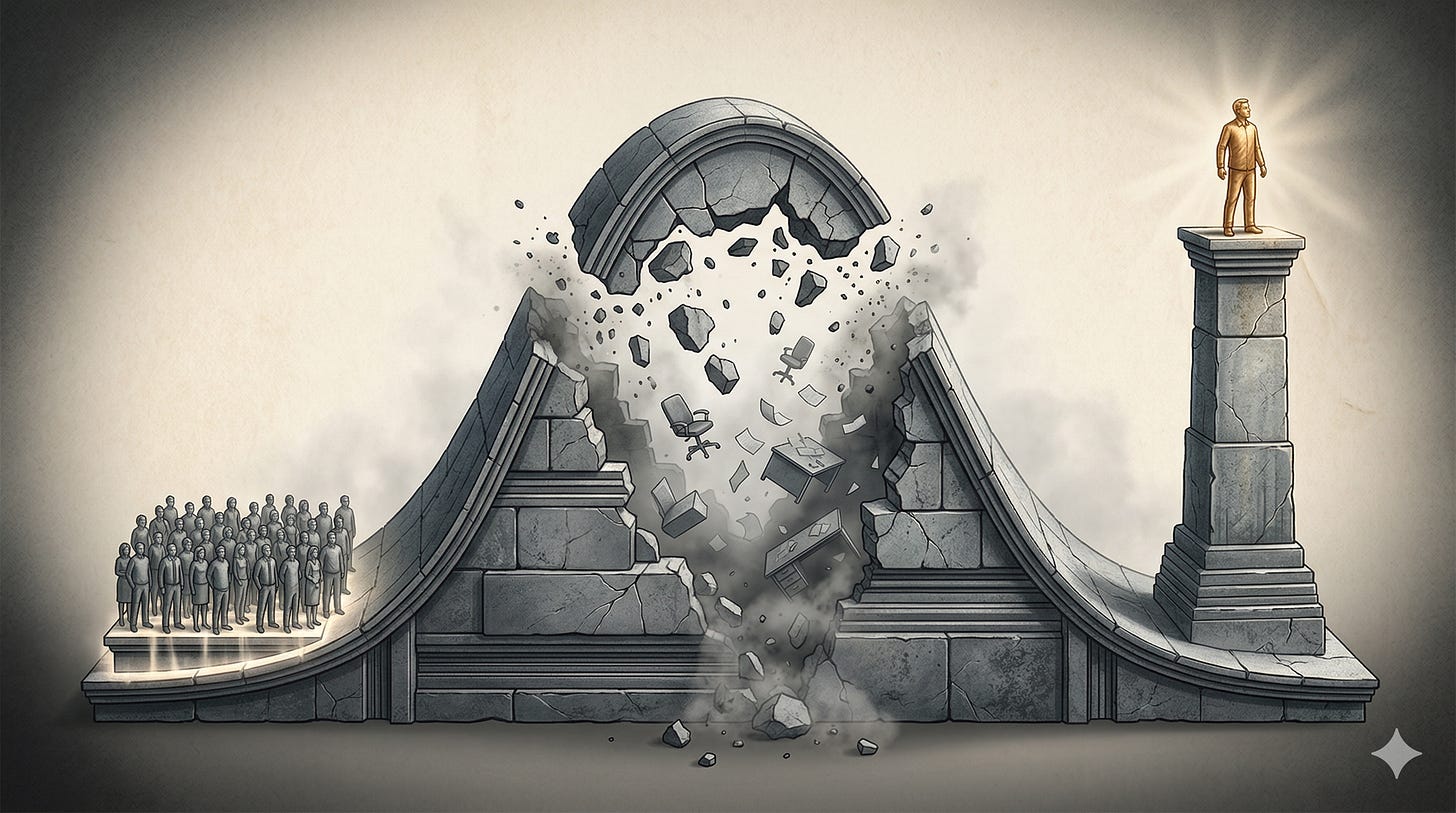 The middle is caught in a compression. The floor has risen to meet them from below. The ceiling has pulled away from them above. The comfortable plateau of “competent and credentialed” is disappearing.